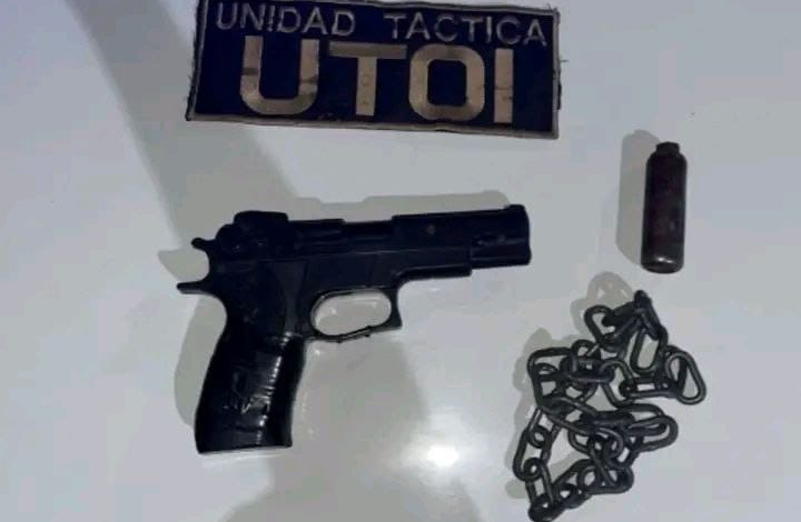 Durante la requisa, los agentes hallaron entre sus pertenencias una réplica de pistola de plástico, color negro, sin marca ni numeración visible, y una cadena metálica de aproximadamente 20 centímetros.