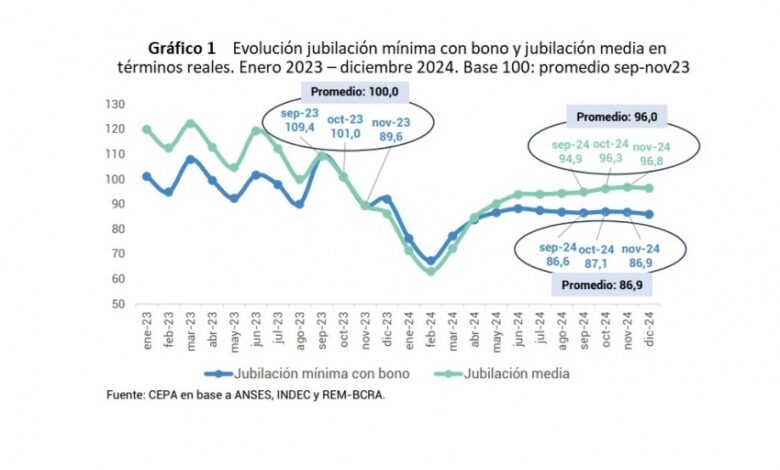 Contrario a las afirmaciones de Milei, los jubilados no lograron ganarle a la inflación: en el trimestre de septiembre a noviembre de 2024, el poder adquisitivo de las jubilaciones sin bono se ubicó 4% por debajo del mismo período del año anterior, y las que incluyen el bono cayeron un 13,1%.