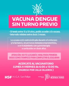 El Hospital Interzonal General de Agudos (HIGA) San Felipe informó que ya se encuentra habilitada la vacunación contra el dengue de manera espontánea, sin necesidad de solicitar turno previo. La convocatoria está dirigida exclusivamente a personas de entre 15 y 59 años.