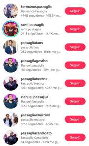 Si bien esto suele verse en internautas alejados del Estado, en nuestro Municipio parece ser una estrategia proselitista. Prueba de ello, son las ocho cuentas de TikTok destinadas a reiterar contenido passaglista. En detalle, si uno ingresa a la aplicación de origen chino y escribe el apellido del clan local le aparecen los siguientes usuarios: “santi.passaglia”; “manu.passaglia”; “hermanospassaglia”; “passagliafans”; “passagliagestion”; “passagliahechos”; “passagliaenaccion” y “passagliacandidato”. Sobran opciones, pero faltan respuestas.