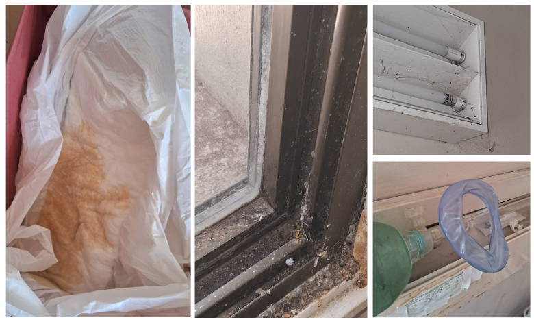 Las condiciones observadas son alarmantes, de acuerdo con el testimonio de los familiares de los pacientes: acumulación de tierra y polvo en superficies; telarañas en techos, luminarias y rincones; suciedad en mobiliario y residuos mezclados, sin clasificación, incluyendo material que debería ser tratado como patogénico. Esta situación implica el incumplimiento de los protocolos de bioseguridad y representa un riesgo concreto e inmediato para la salud de los internados.