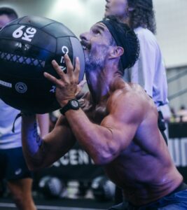 - Wall Balls (100 repeticiones):Lanzamiento de balón medicinal a diana a 3 metros de altura desde sentadilla rompiendo el paralelo.