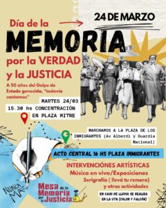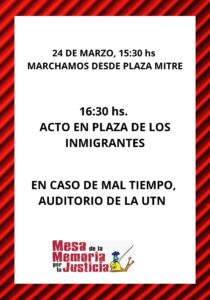 Desde la Mesa de la Memoria por la Verdad y la Justicia también informaron que en caso de mal tiempo para garantizar la realización de las actividades el acto central se trasladará al Auditorio de la Universidad Tecnológica Nacional UTN el cual está ubicado en las calles Colón y Falcón.