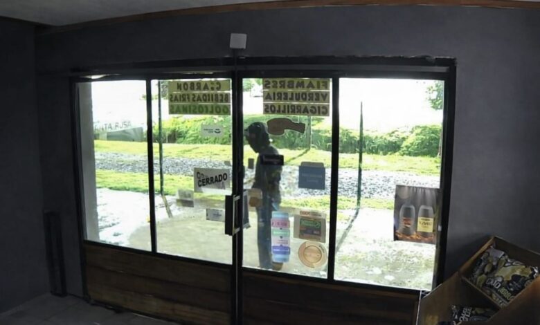 Para concretar el robo, el delincuente arrojó una piedra que rompió el vidrio de la puerta e impactó contra una heladera exhibidora, generando daños en el interior del comercio.