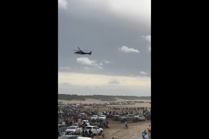 El hecho ocurrió ese domingo pero se conoció tras la viralización de fotos y videos. Turistas y locales disfrutaban de la playa “La Olla”, hasta que en un momento un helicóptero, a baja altura, se acercó hasta la zona de los médanos, comenzó a tirar dólares y luego descendió, lo que provocó un riesgo enorme para todas las personas del lugar.